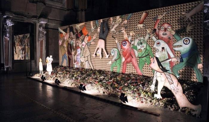 Avrebbe dovuto essere esposta a Palazzo Reale, il 17 maggio 1972. Ma tutto saltò per l’uccisione del commissario Luigi Calabresi. Niente presentazione, niente esposizione. L’opera girò in Europa, ma riapparve a Milano solo nel 2003 a Brera. La storia dell’opera è questa: Baj la regalò a Licia, la vedova di Pinelli, che non sapeva dove tenerla, così l’artista riuscì a venderla alla Fondazione Giorgio Marconi donando il ricavato alla famiglia Pinelli. Dopo quarant’anni , nel 2012, l’opera è stata esposta finalmente a Palazzo Reale, nella sala delle Cariatidi, per iniziativa del sindaco Giuliano Pisapia.