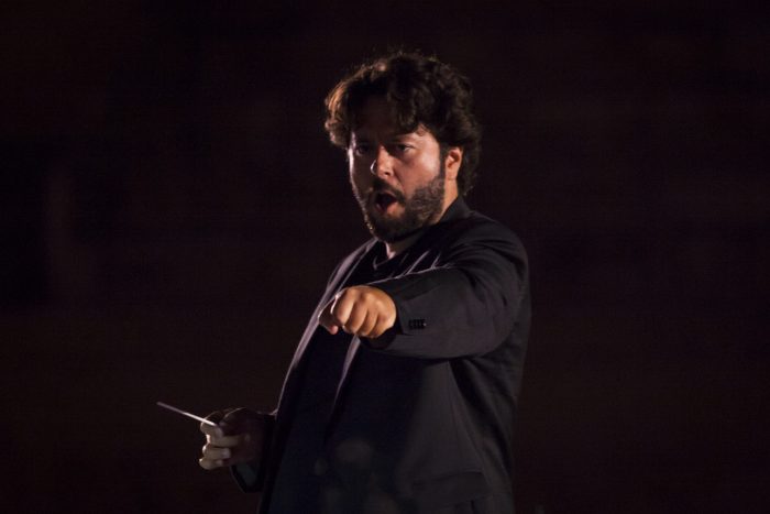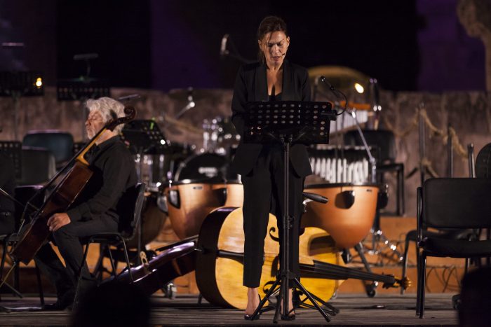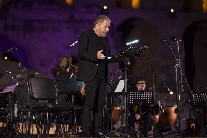 A lui, ad uno dei geni della letteratura italiana è dedicata la prima parte dell’evento, ideato, voluto ed organizzato dal Maestro Filippo Arlia, quarta edizione del “Fortissimo Festival”. Sul palcoscenico una grande coppia del teatro italiano, il mito del teatro Gabriele Lavia e una affascinante e magnetica Federica Di Martino. Alle spalle del pubblico le antiche gradinate e di fronte come scenografia i tre ordini di arcate dell’anfiteatro e poi l’incipit di una voce affabulatrice e coinvolgente, quella del Maestro Lavia, che interpreta “ Supplica a mia madre”, una delle poesie più intese e emozionanti di Pasolini e poi “ A un Papa”, ed è proprio su questa poesia che Lavia colpisce dritto al cuore quando recita una delle frasi più intense e caustiche di Pasolini:“ Lo sapevi, peccare non significa fare il male: non fare il bene, questo significa peccare”. Si riparte con la musica e poi a seguire Federica Di Martino, smoking nero e sguardo che non perdona recita la poesia “Alba meridionale”, un pugno allo stomaco, versi di denuncia e di passione. Un susseguirsi di applausi, musica e poesie tradotte per il pubblico francofono su un maxischermo in francese. Pasolini, grazie ai suoi versi ci porta in giro per la sua Roma grazie ai due interpreti d’eccezione: “Serata romana”, “Verso le Terme di Caracalla”, “Sesso consolazione della miseria”, “Il mio desiderio di ricchezza”, “Trionfo della morte”.
