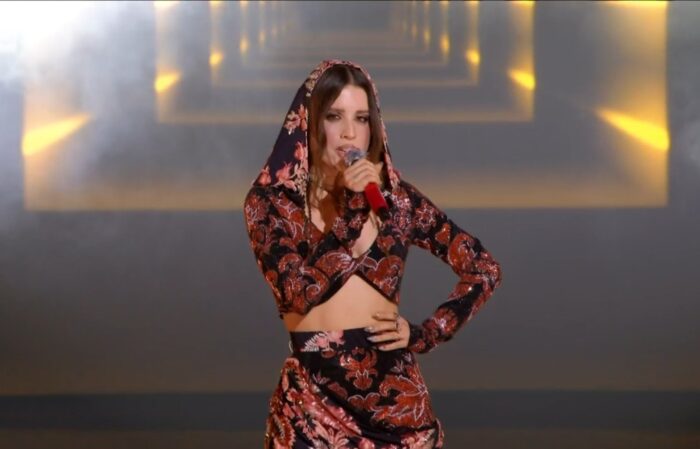 ANGELINA MANGO: Un coordinato che stupisce e ci piace. Un look giovanile che le si addice e si lega bene al brano cantato. Angelina è completamente a suo agio e domina il palco con grinta ed energia e il pubblico apprezza.