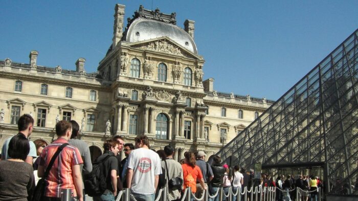 Visitatori in coda per il entrare al Louvre. Fonte Wikimedia Commons
