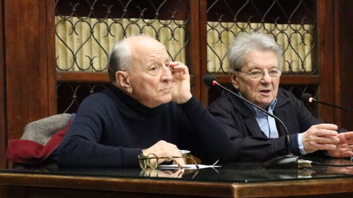 Da sinistra, il filosofo Michele Ciliberto e Adriano Sofri al Gabinetto Vieusseux di Firenze per “Testo” 2025. Foto Stefano Miliani
