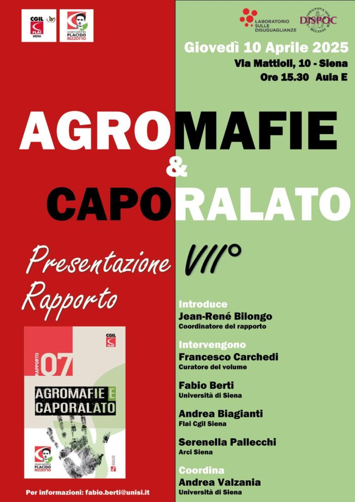 La presentazione sarà anche un’occasione per riflettere su quanto accade da tempo in Toscana, in particolare nella provincia senese, dove il lavoro agricolo irregolare è una realtà diffusa e dove si registrano casi di infiltrazioni mafiose, come ci ricorda la vicenda della tenuta di Suvignano.