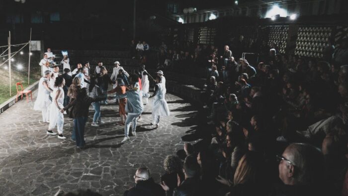 “Abitato da un’infinità di sogni”. L’appuntato enumera vari divieti: non si può infrattarsi dietro le piante, non si può volare né (articolo 76 del regolamento) si può sognare. Un detenuto-attore africano ha appena confessato di essere “abitato da un’infinità di sogni” e di aver sognato di trovarsi solo nel deserto e prossimo a morire. I drammi filtrano. Una violinista e una flautista accompagnano ogni tappa con brani evocativi, da loro elaborati, finché il percorso non viene coronato da una recitazione in ottava rima e un ballo popolare nell’arena in cui i detenuti-attori, spettatrici e spettatori condividono un momento, per la frazione di pochi minuti, liberatorio.