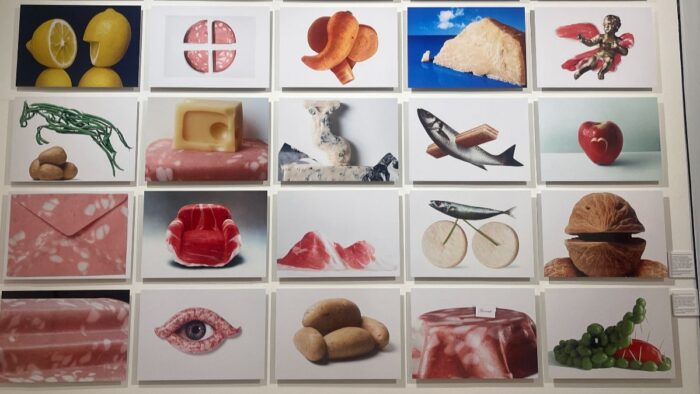 Oltre la pittura anche le campagne pubblicitarie più conosciute, come quelle per la Pirelli o per la Esso. Ecco le salette dedicate agli iconici Caballero e Carmencita presentati attraverso materiali audiovisivi attraverso vecchie televisioni a tubo catodico, il medium per le quali erano state pensate. La sua genialità e fantasia si dispiegano a pieno nelle campagne dedicate al cibo. Un esempio emblematico di questo si trova nella sala centrale del primo piano all’ interno della quale sono collocati tanti piccoli quadri in cui l’ artista immagina gli alimenti come o elementi di design: la poltrona rivestita di prosciutto crudo, il tavolo con la tovaglia di mortadella, o il divano composto da patate o ancora immagina gli elementi della natura trasformando uno scoglio sul mare in uno scoglio di parmigiano.