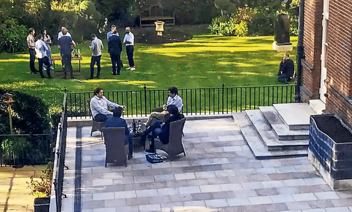 Johnson è seduto ad un tavolo all’aperto con la moglie Carrie ed altre due persone, con bottiglie di vino e formaggio in bella mostra. Poco più lontano c’è un altro tavolo con quattro persone, e altro vino. Mentre sul prato, altri nove sono in piedi attorno a un tavolo, con alcolici, tutti vicini tra loro. In un’atmosfera obiettivamente rilassata, e non da meeting di lavoro.